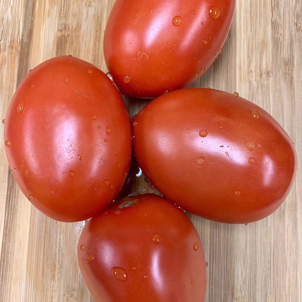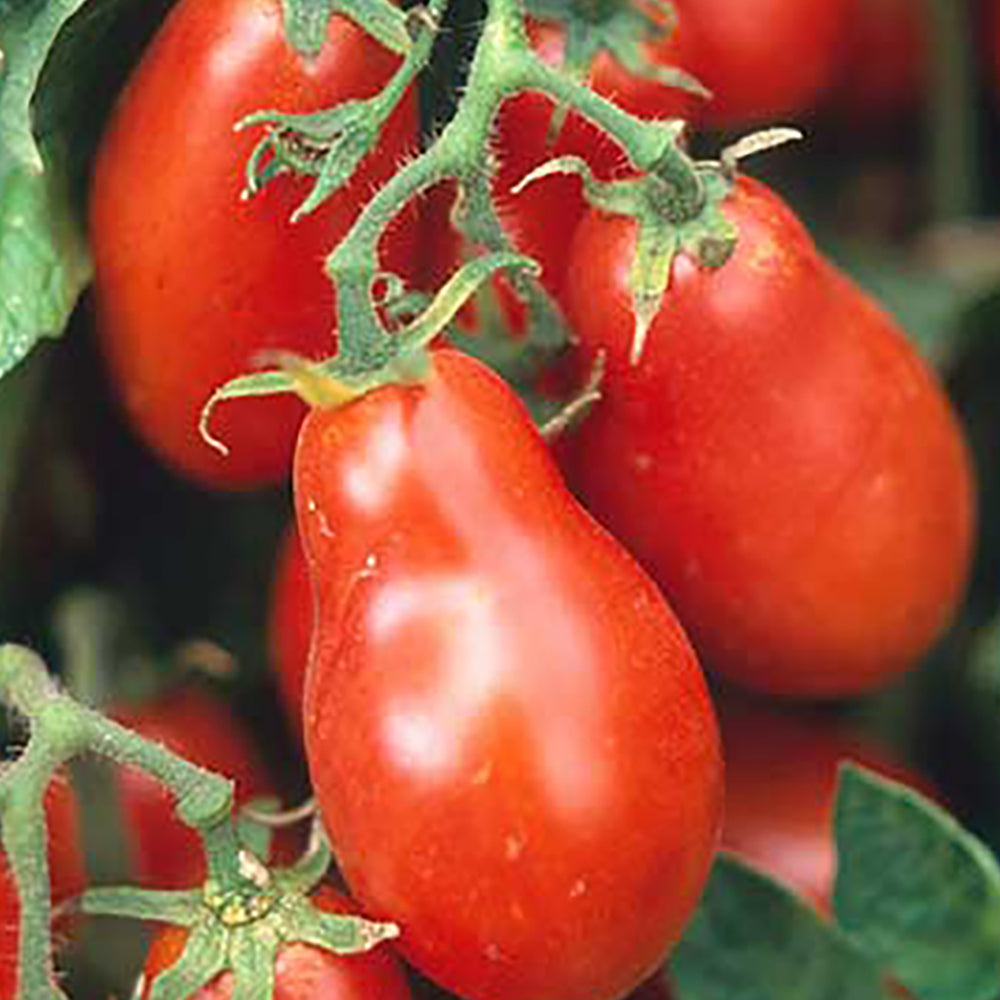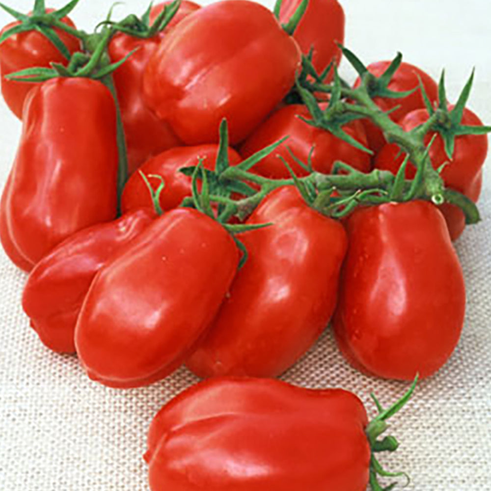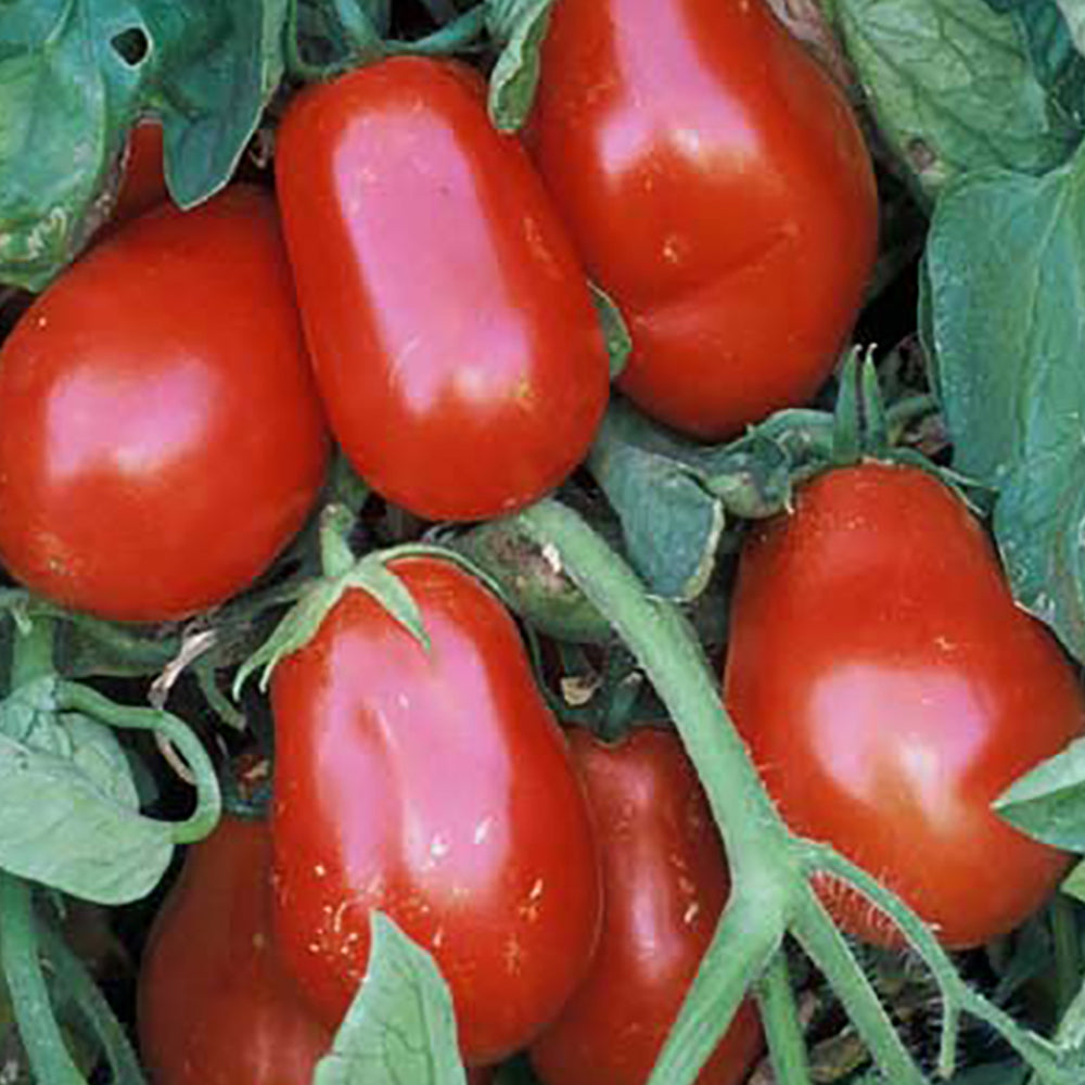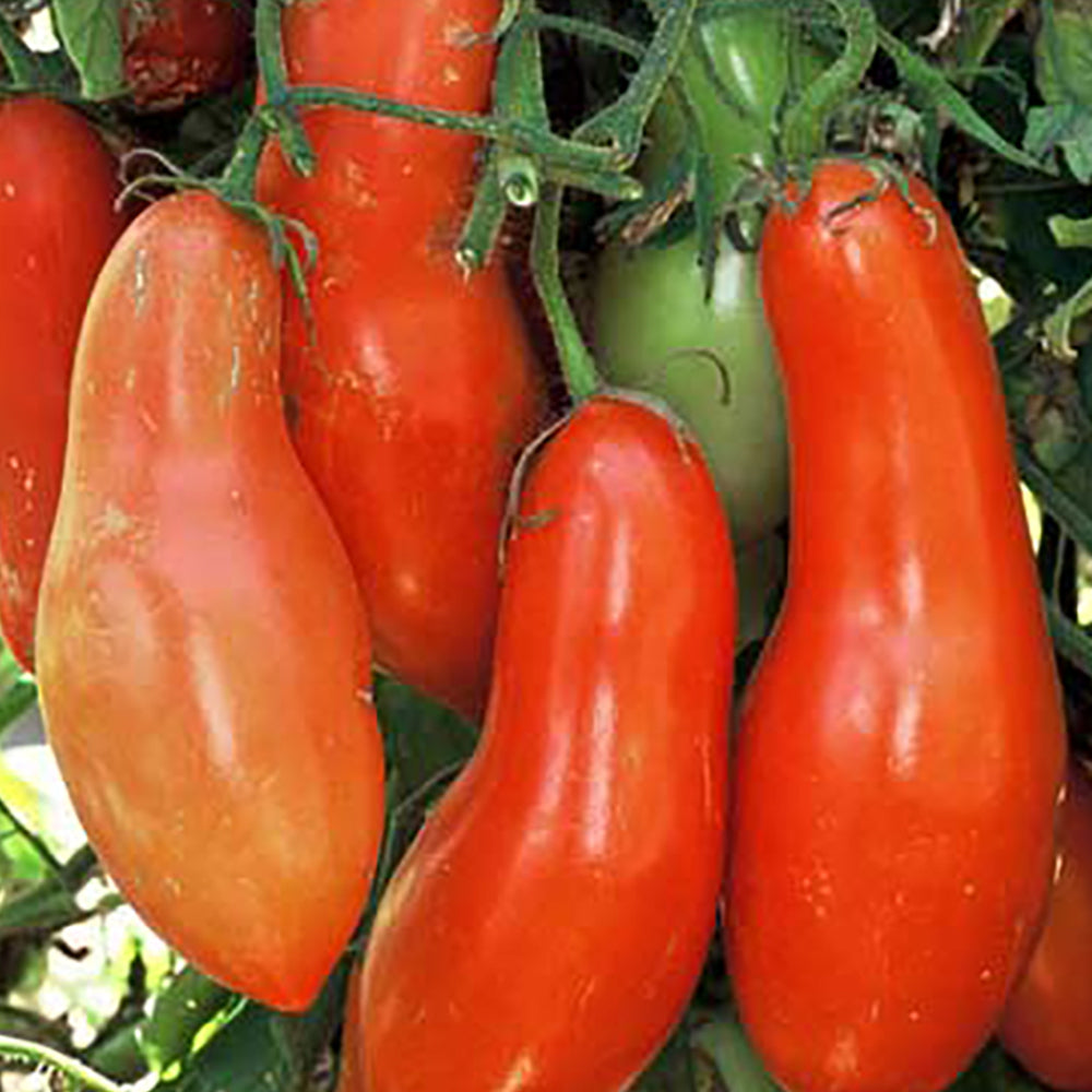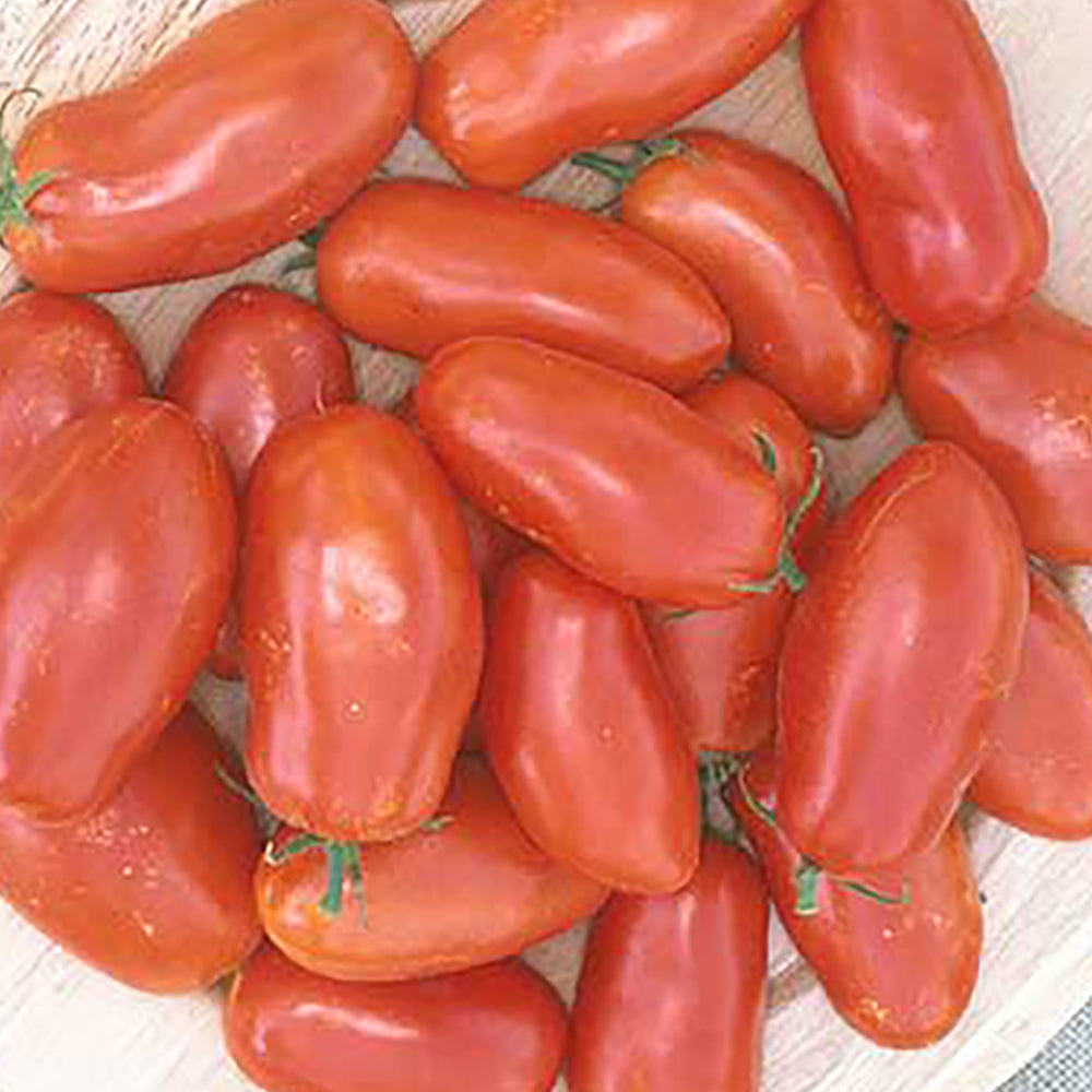 Excellent for canning, tomato paste, or puree. Rectangular pear-shaped, 3-1/2 inch long fruit with mild flavor and meaty texture. Bright red color. Indeterminate. 80 days.