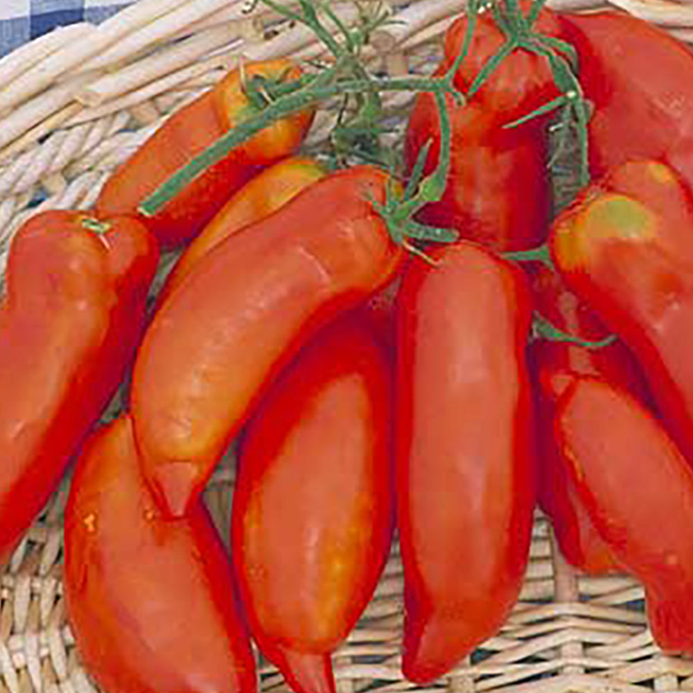 Very productive hybrid tomatoes with the classic San Marzano shape are 4-1/2 inches long with solid flesh that makes the most flavorful sauce. Because the tomatoes have minimal juice, they cook down quickly while keeping that old-fashioned Italian taste. Vigorous plants set abundant clusters of these beautiful red paste tomatoes that cost a premium price when you buy them in a can. It's so much better to grow your own! This variety does well in outdoor gardens as well as in greenhouses and high tunnels. Indeterminate. 72 days.
