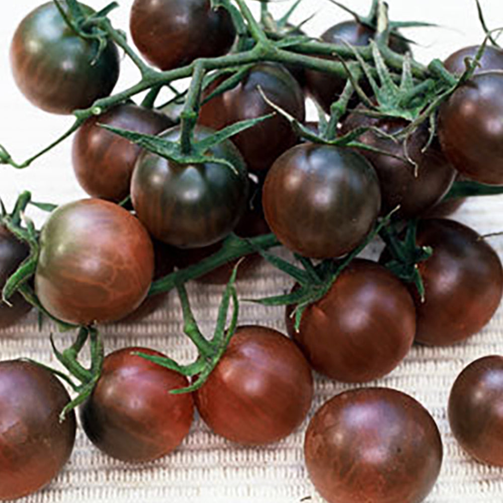 This is the first truly black cherry tomato and our own exclusive variety. It is not a plum, but a perfectly round cherry with classic black tomato flavor, sweet yet rich and complex. Fruit picks clean from the stem and is produced in abundance on vigorous, tall plants. These cherries are irresistibly delicious and a unique addition to the color spectrum of cherry tomatoes now available. Selected by the founder for sweetness, increased crack tolerance and yield. Indeterminate. 65 days.