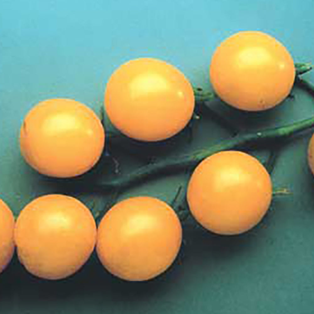 Vigorous vines produce abundant clusters of 1/2 oz. bright yellow-gold cherry tomatoes with delicious sweet flavor. These tomatoes are naturally sweeter than red cherry varieties with a fruitier taste. Once you taste them, you'll be spoiled forever. Indeterminate. 60 days.