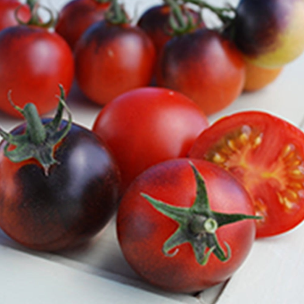 Chefs and gardeners alike are going to be talking about this cherry tomato because of its striking looks and delicious, sweet flavor. 1 ½ inch round fruit are dark purple to almost black and streaked with mottled patterns of green. This is a great tomato for fresh salads and appetizers, where the appearance and texture of the fruit can really shine. Market gardeners will like mixing these into their pints of colorful cherry tomatoes. This crack-resistant variety can be grown either outdoors or in the greenhouse. Indeterminate. 70 days.