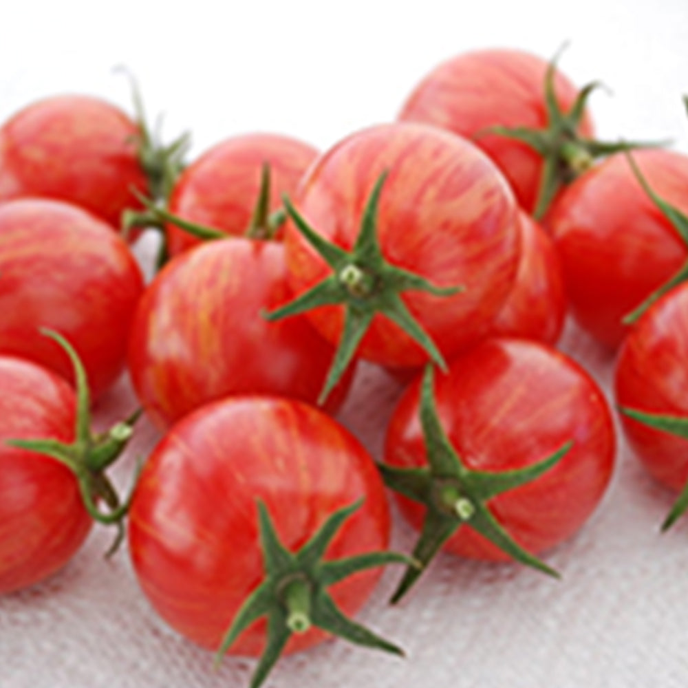 Pretty 1 ½ inch round cherry tomatoes are dark pink striped with yellow and perfect for fresh tomato salads. Sweet flavor and distinctive appearance make them a great choice for market growers to use in colorful pints of mixed cherry tomatoes. Crack-resistant fruit develops on strong plants that can grow well outdoors or inside a greenhouse. Indeterminate. 70 days.