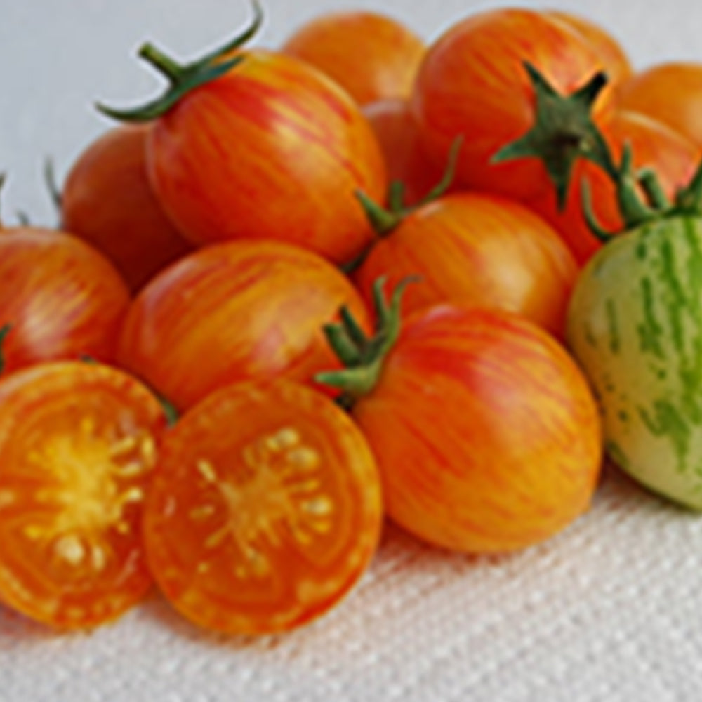 Another stunning cherry tomato in the "Bumble Bee" collection, this one is round and deep yellow with red stripes on the outside and pink marbling inside. Their flavor is delicious, sweet yet acidic and complex. Pair them with the other Bumble Bee cherries or alongside any of the Artisan tomatoes for a visual and culinary feast. Indeterminate. 70 days.