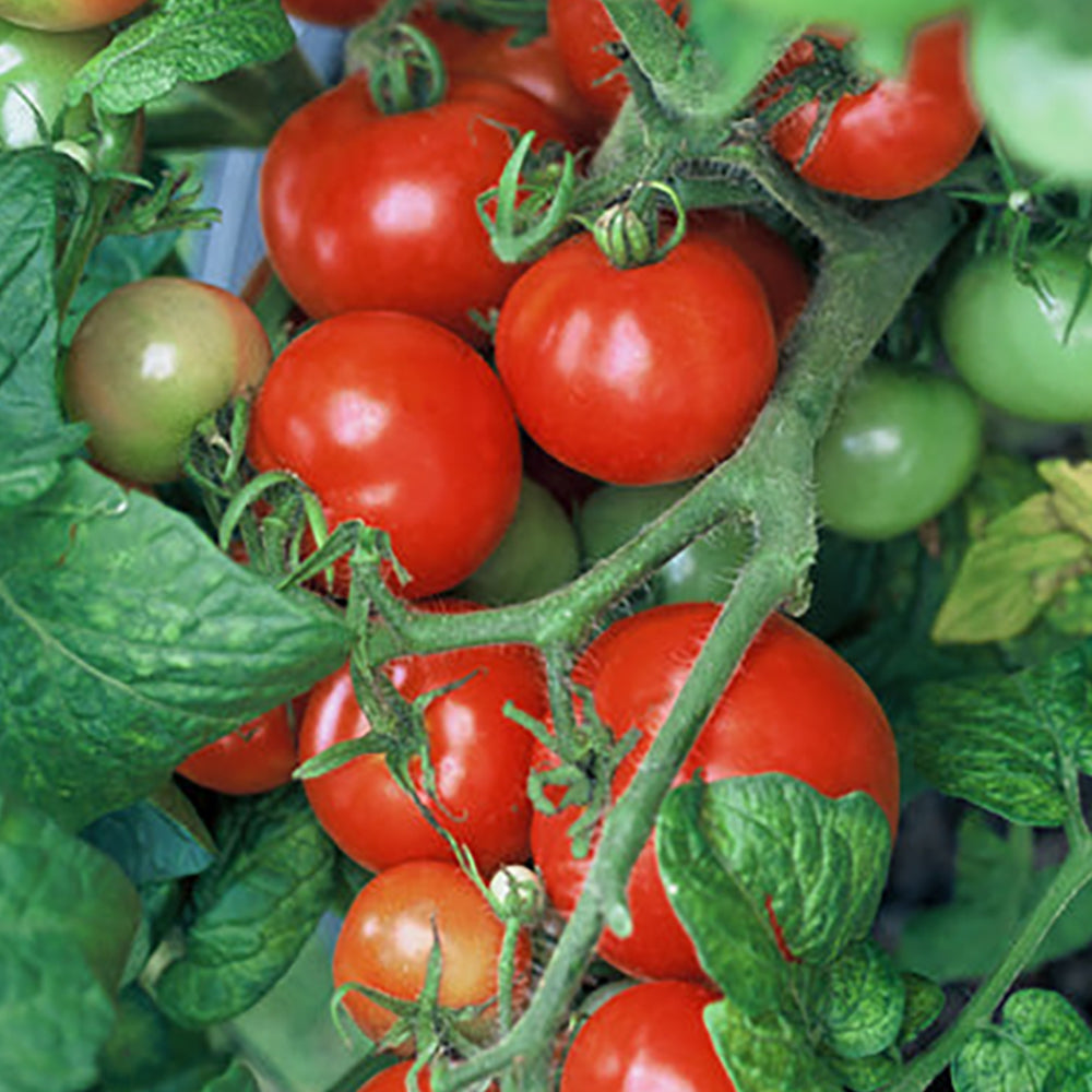 Perfect for container growing, this dwarf tomato plant only becomes 10 to 12 inches tall, but produces lots of flavorful, small red tomatoes. Dark green, quilted leaves are attractive and fruit is abundant, making this a great variety for indoor gardening. Needs no staking. Determinate. 70 days.