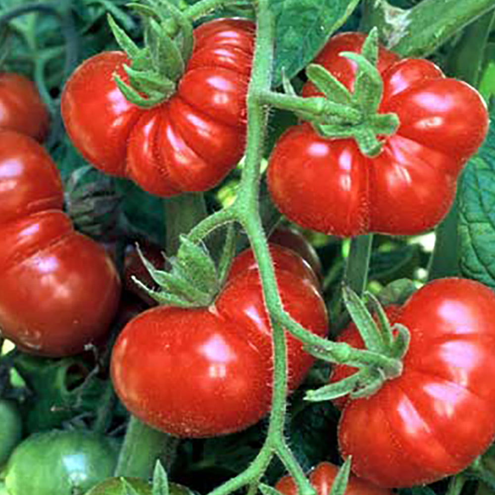 A tomato like you've probably never seen before, these small, ruffled red fruit are unique in appearance, but distinctive in flavor also. Their taste is rich and assertive, slightly sweet with a bit of zing added in. Only about 2 inches across, these flattened scalloped tomatoes appear in great profusion, perfect for cutting into halves for a salad or using on plates as a garnish. Indeterminate. 72 days.