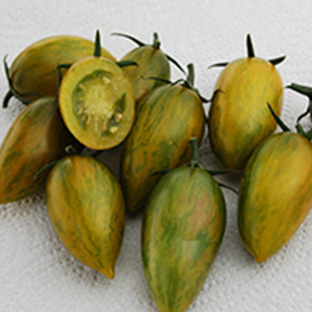 Attractive green and yellow striped tomatoes have a unique, elongated shape, about 2 inches long and 1 inch wide and tapered at the tip. But even more impressive than their appearance is their bright, acidic yet sweet flavor. The taste is similar to that of Green Zebra, and very refreshing and delicious. Chefs as well as home cooks will find these tomatoes quite versatile in the kitchen, and they pair beautifully with the other "tigers" in this series. Indeterminate. 70 days.