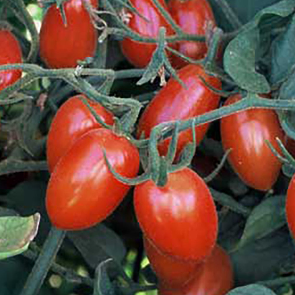 This open-pollinated version of Grape Tomato has the same wonderful sweet flavor, size, and shape as the original Grape, but has the advantage of shorter plants. Elfin's clusters of delicious, uniquely-flavored grape-shaped cherry tomatoes have a sweetness that is unmistakably 'grape.' Determinate. 60 days.