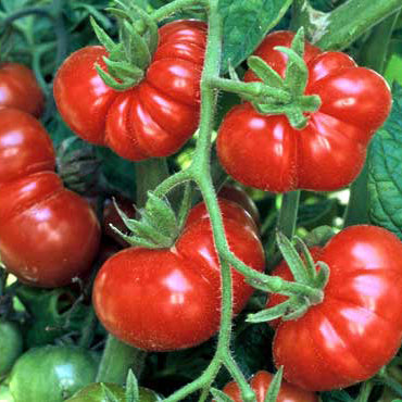 A tomato like you've probably never seen before, these small, ruffled red fruit are unique in appearance, but distinctive in flavor also. Their taste is rich and assertive, slightly sweet with a bit of zing added in. Only about 2 inches across, these flattened scalloped tomatoes appear in great profusion, perfect for cutting into halves for a salad or using on plates as a garnish. Indeterminate. 72 days.