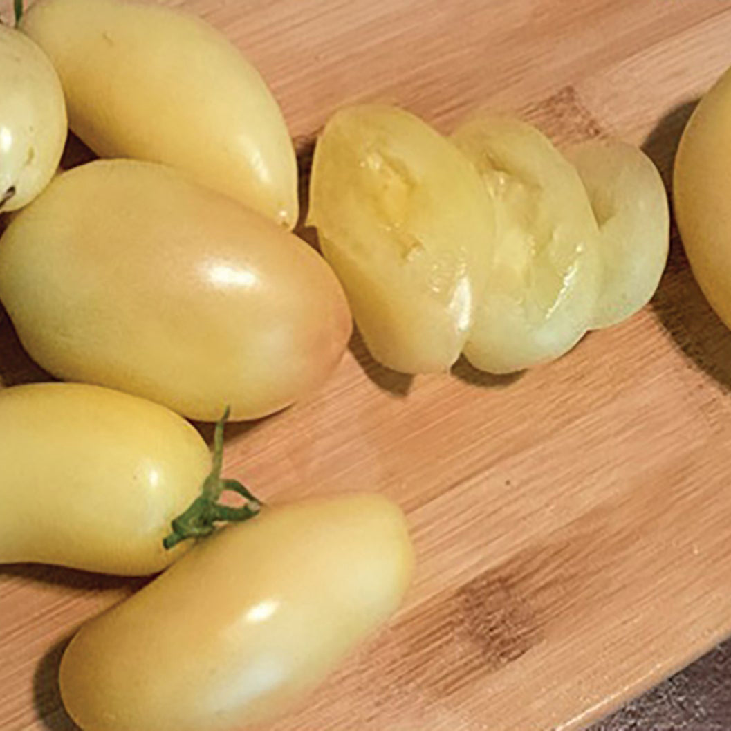 This variety was developed by Tom Wagner from heirloom stock. He focused on making a more productive plant and creating flavor that is great for making sauces. The cream to yellow colored fruit are nearly 3 inches long and are shaped like a sausage. The determinate 3 foot bush plants don’t need to be staked. 75 days.