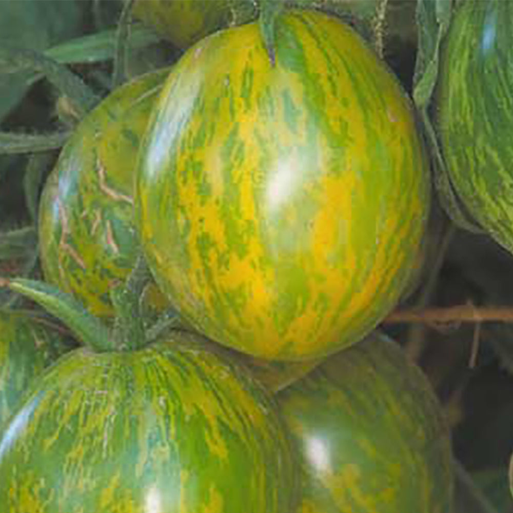 A unique and delicious salad tomato. 3 oz. green fruits ripen to amber-green with darker green stripes. The light green flesh is very flavorful, sweet yet zingy. This one is a real taste treat. Indeterminate. 75 days.