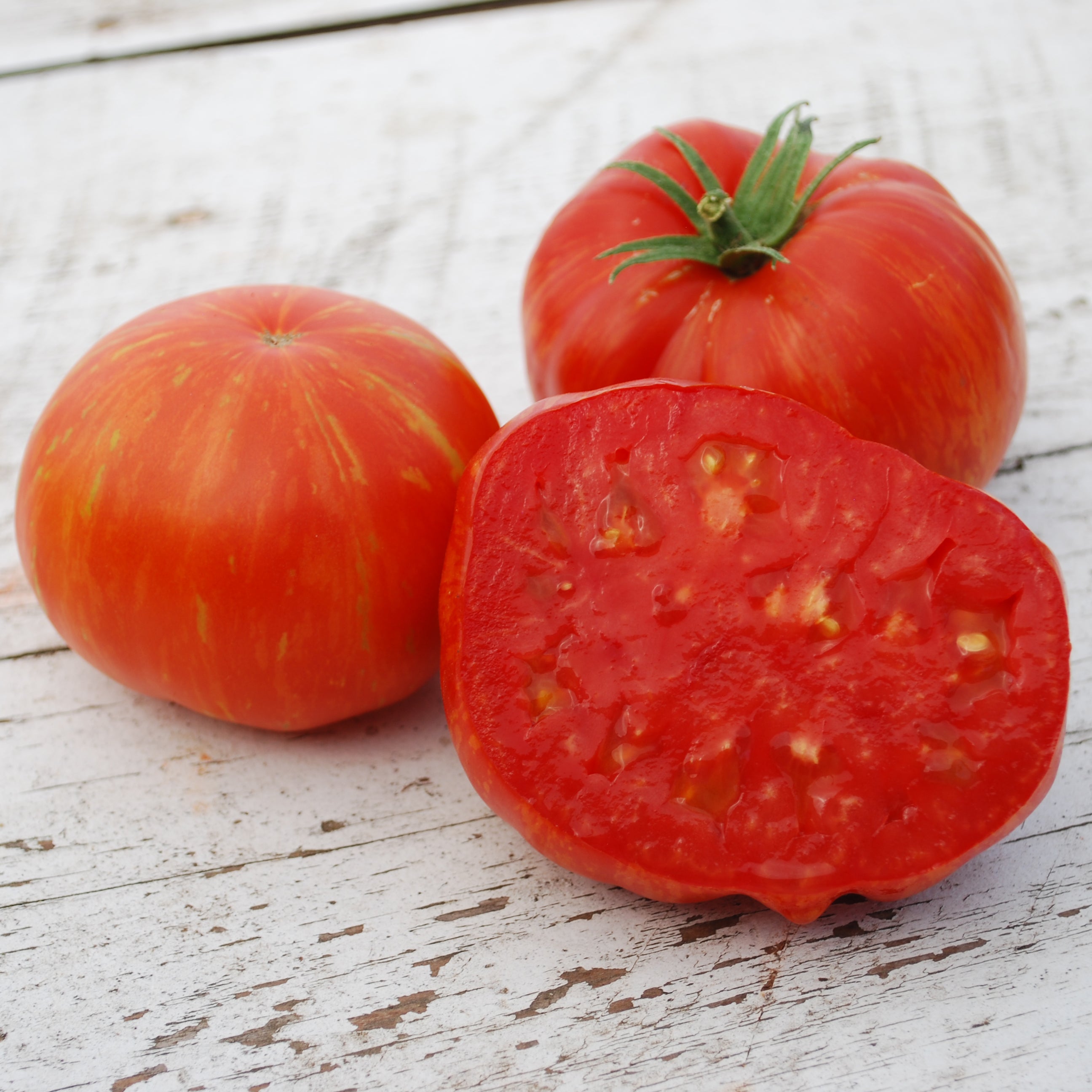 Meaty red-fleshed beefsteak fruit are mildly sweet, and deliciously full flavored. Beautiful golden stripes are intermingled with deep red tones, providing a striking color on these 6 to 10 ounce fruit. Plants are vigorous and productive, with indeterminate vines. 75 days.