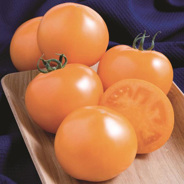 Developed by the company that brought you the Momotaro tomato (we affectionately refer to this as Momotaro Gold at Tomato Growers). Heavy production of bright gold to golden orange, 7 to 8-ounce fruit that are super-sweet and that can set in colder temperatures. Produces over a long period. Works well in greenhouses, high tunnels, and home gardens. Resists blossom end rot and cracking. Great for roadside stands. Strong disease package ToMV, F 1+2, V, SB, and nematode. Indeterminate. 75 days.