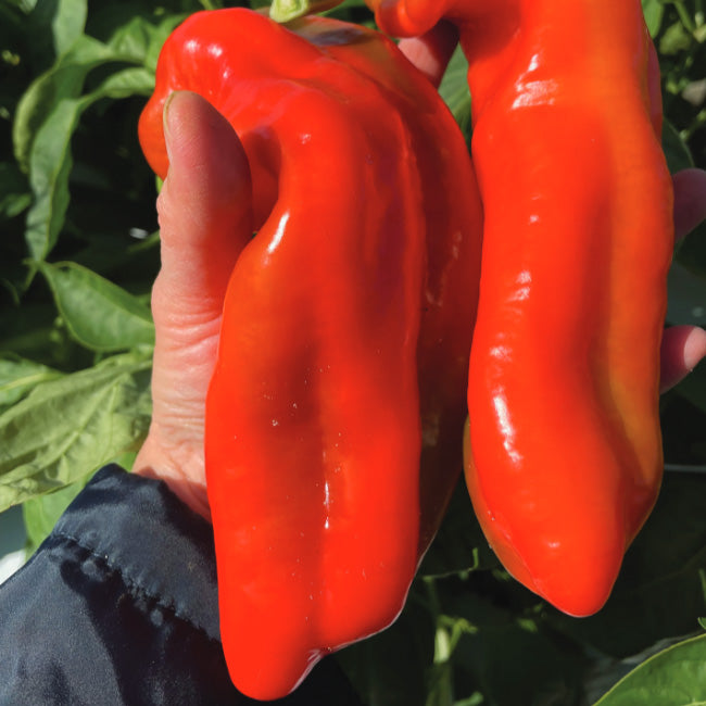 Get ready for Red Impact hybrid: a large 7x4 inch, 8 to 9 ounce pepper that has a touch of sweetness when green which develops to very sweet as it matures to a deep red color. The plants have plenty of productivity and won the All-America Selections National Award! Released by the creators of Giant Marconi, Red Impact blocks Tobamo virus, Pepper Mottle virus, Tobacco Etch virus, Bacterial Spot races -,1,2,3,4,7,8,9 and Root Knot nematodes. Don’t walk; run to get this treasure! 75 days.