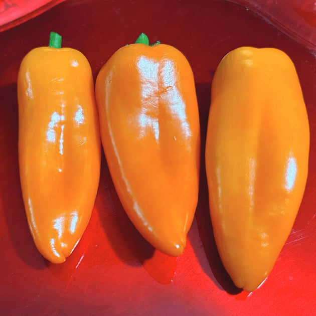 Yummy Snack Orange hybrid pepper produces deliciously sweet, and crunchy fruit that are fun to eat. The fruit mature from emerald green to brilliant orange on a plant that continues to produce over the growing season. Pick the ripe fruit each morning and take them with you to snack on during the day! The fruit are 3 ¼ to 3 ¾ inches long, and 1 ¼ inches in width. There are few seeds and plenty of flavor in each bite. Due to the continued fruiting in most environments, plants benefit from support stakes. Well-suited for growing in containers of at least 3 ½ gallons. 65-75 days.