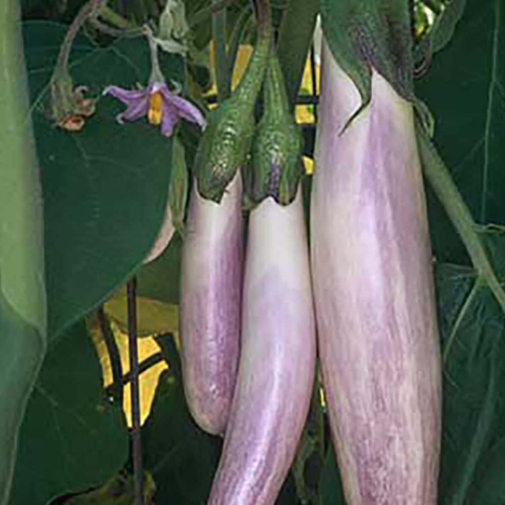 Slender Asian type eggplant are white with faint stripes of pale lavender, as if delicately colored with a paintbrush barely dipped in paint. Fruit become about 8 inches long with white flesh and an excellent, mild flavor. Plants are compact and well-branched, bearing 2 to 3 eggplant per cluster. 65 days.
