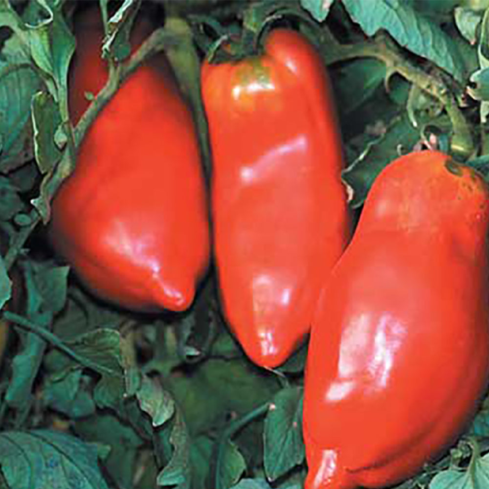 This is one of the best paste tomatoes we know, primarily because it makes sauce so good and sweet that you wouldn't even have to add flavoring to it. Tomatoes are large, at least 5 inches long, and shaped like a banana pepper with a pronounced tip on the bottom. Plants have wispy-type foliage, but are vigorous and very productive. The fruit has very few seeds and is extremely meaty with a rich, sweet flavor. Although they make outstanding sauce, these tomatoes are good enough to eat fresh. Heirloom variety originally from Poland. Indeterminate. 75 days.