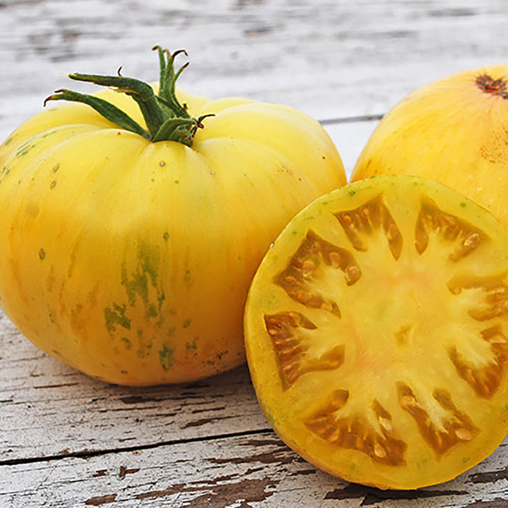 Vigorous indeterminate vines produce delicious yellow fruit with a creamy and intense sweet flavor. Fruit are large, reaching up to one pound. Lower in acid than most tomatoes, the powerful flavor punch makes this variety particularly enjoyable. The fruit have a rose colored blush at peak ripeness near the blossom end. 75 days.