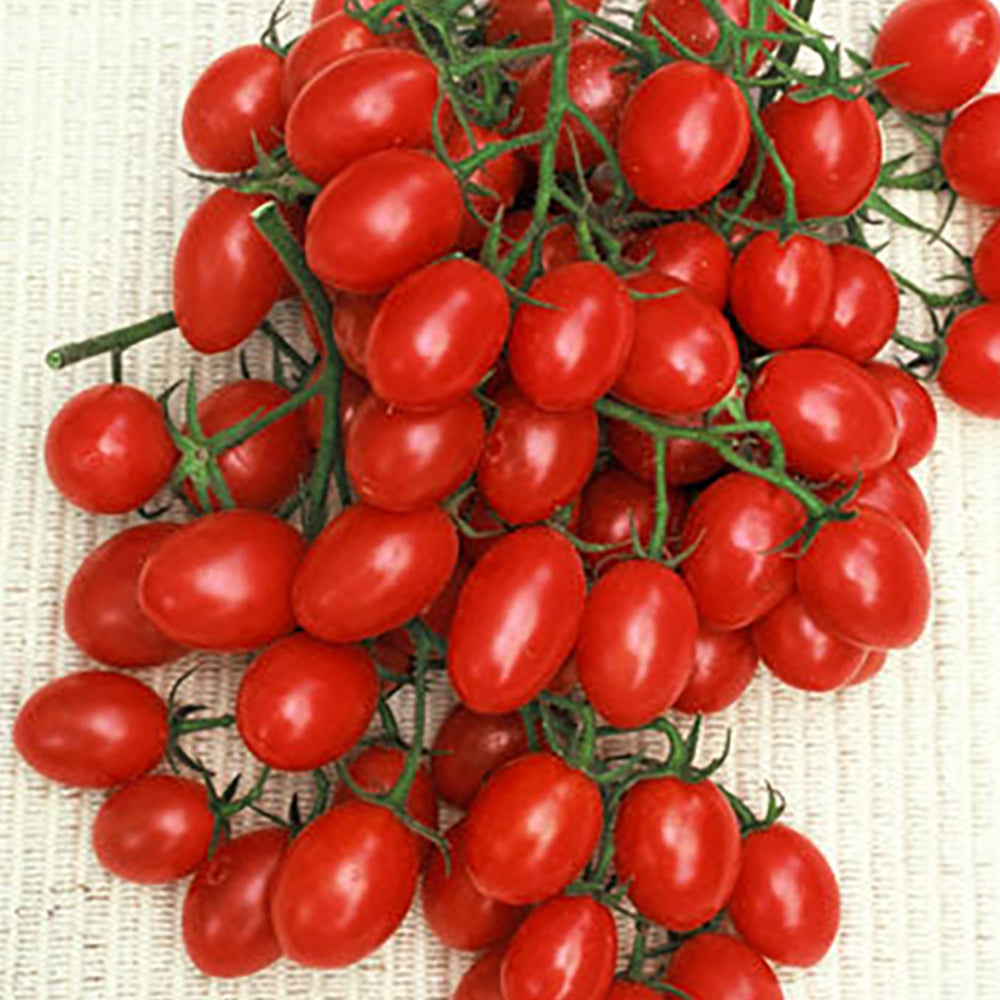 This is the only pink grape tomato we know of that is really the size and shape of a red grape tomato. Long clusters of small, oval fruit are deep rosy pink and abundantly produced on tall, vigorous plants. These tomatoes are as sweet as rosé wine, and a delightful new choice for anyone who likes grape tomatoes. Indeterminate. 60 days.